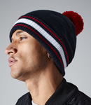Double layer knit. Cuffed design. Contrast pom pom and striped cuff. Tear out label.